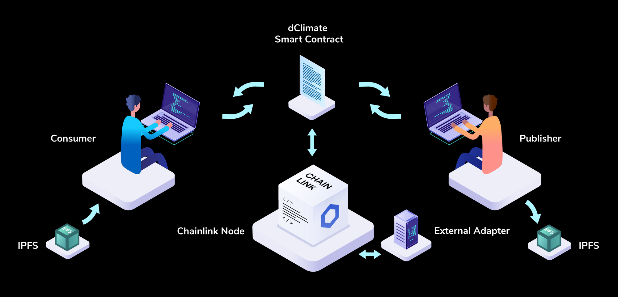 In addition to being an integral component of dClimate’s governance layer, Chainlink powers much of dClimate’s internal infrastructure, with the dClimate marketplace leveraging Chainlink to retrieve climate data and validate it on-chain. Chainlink external adapters are used to connect the data-retrieving decentralized oracle network (DON) to proposed and approved algorithms for determining “skill scores,” which reflect the accuracy and reliability of climate and forecasting data.
