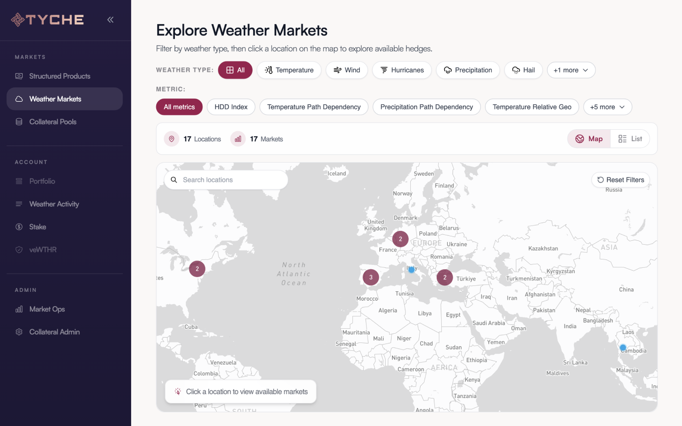 Today, dClimate is announcing Tyche, a programmable platform designed to change that structure. Tyche modernizes how insurance, reinsurance, and insurance-linked exposure is structured, funded, and traded by starting with the portfolio itself. Instead of forcing portfolios to conform to pre-defined contracts, Tyche enables portfolio-specific exposure to be isolated, modeled, and transformed into bespoke financial products that can be directly matched with capital seeking yield and uncorrelated returns.