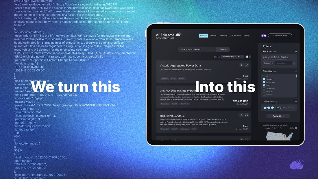 dClimate is revolutionizing the way that businesses, governments, and individuals access climate information. The platform connects global users with institutional-grade data and risk models to create powerful solutions for tackling climate change resiliently–all on an immutable ledger that indexes and organizes Earth’s entire environmental record. Now everyone has a shot at advancing verifiable action globally, unlocking new potential in combating the most pressing challenge of our time.
