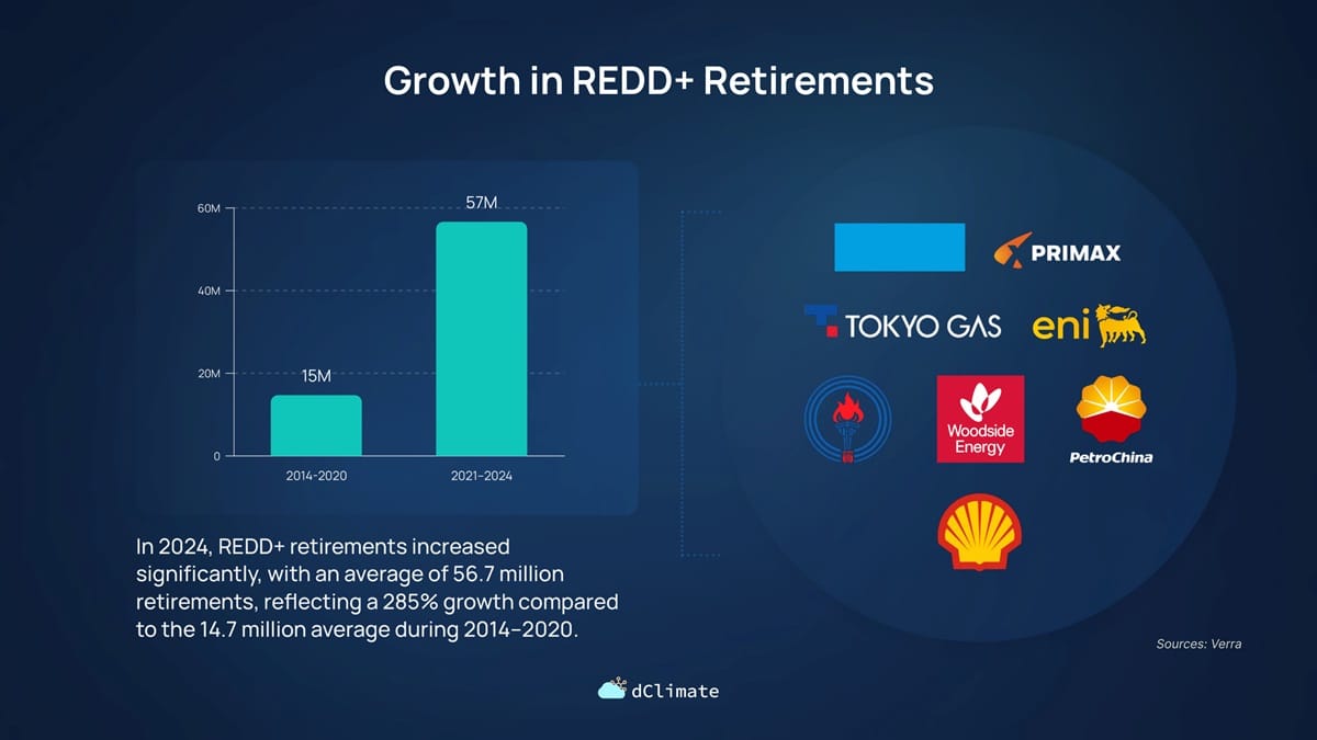Major contributors to this trend include companies like Shell, which retired over 29 million REDD+ credits from 2020 to 2024 YTD, and Eni, which retired nearly 12 million credits over the same period.