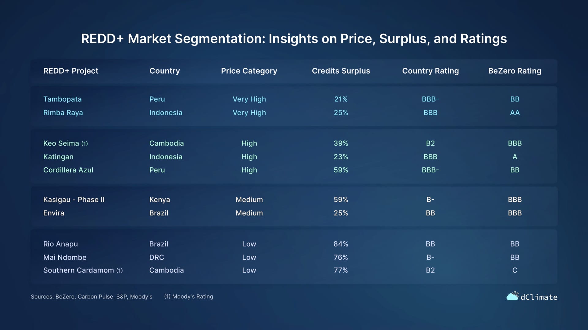- In sub-investment-grade environments (e.g., Cambodia (rated B2 by S&P), DRC (rated B- by S&P)), projects like Southern Cardamom and Mai Ndombe often land in lower price tiers.
